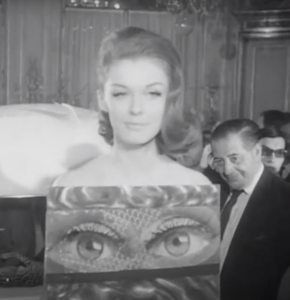 As the film progresses it features a compilation of highlight clips from show, such as one model sauntering down the runway with eyes painted over her breasts and another carrying an inflatable baseball catcher on her back. One bizarre scene even captures Dali measuring the flatness of a model’s chest which appears to be bound tightly by fabric.